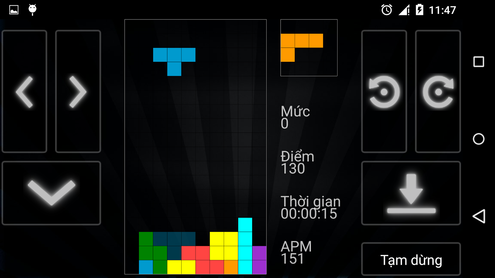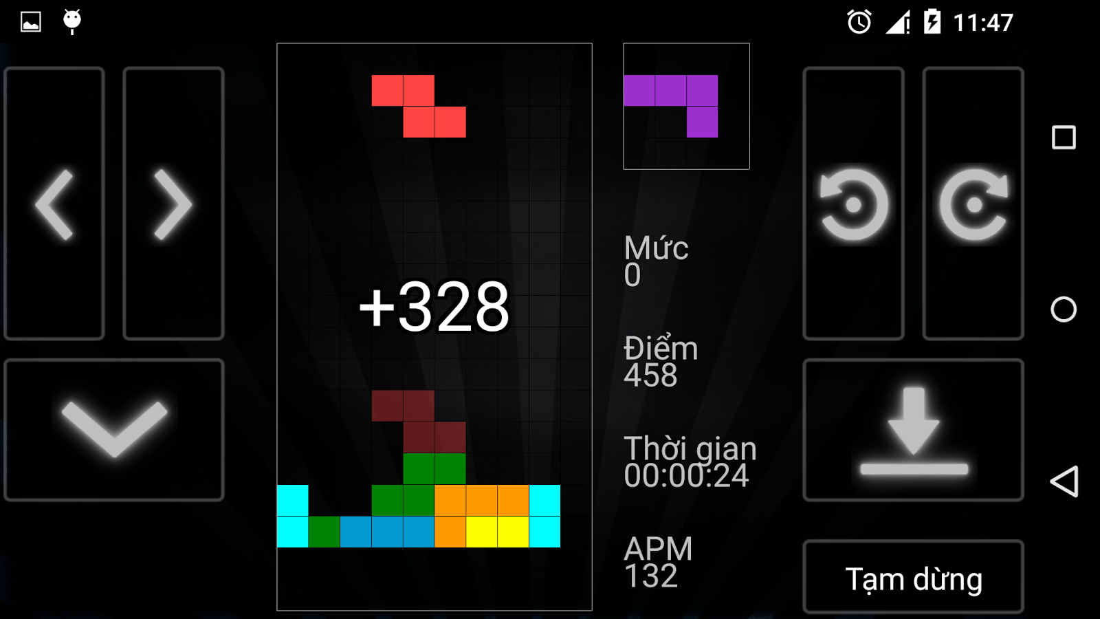 Ngoài ra người chơi nhận được một số điểm thưởng cho việc sử dụng Soft Drops hoặc Hard Drops. Soft Drops được thưởng thêm 1 điểm cho mỗi dòng, trong khi Hard Drops được thưởng 2 điểm cho mỗi dòng.Còn nhiều tính năng thú vị và hấp dẫn trong thế giới game xếp gạch đang chờ đón các bạn khám phá ở phía trước đó.Còn chờ gì mà không tải game xếp gạch về điện thoại và chiến thôi nào các bạn.Chúc các bạn có những giờ phút giải trí thú vị cùng trò chơi.